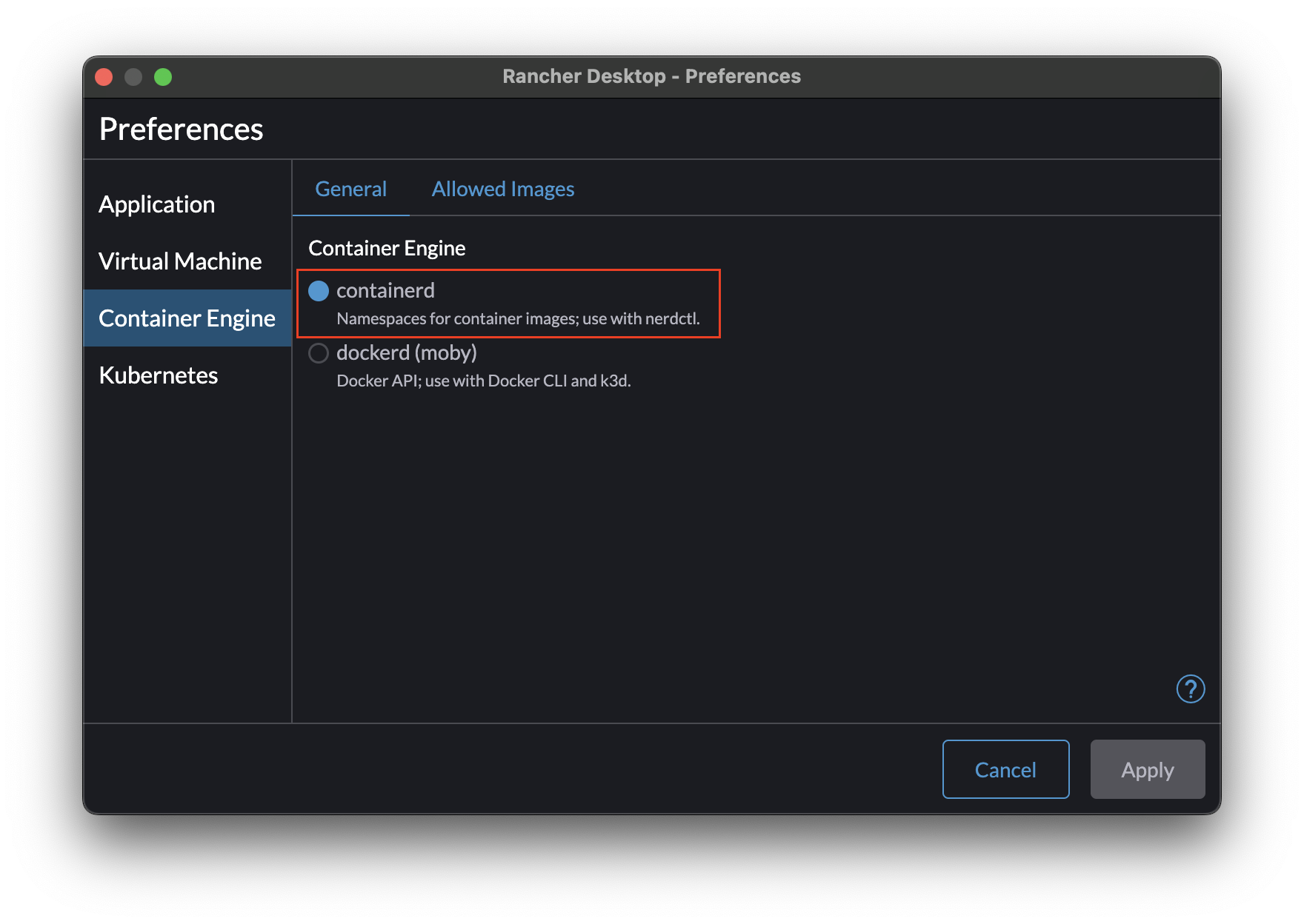 이는 컨테이너 엔진 때문에 발생하는 문제이므로, macOS를 기준으로 당황하지 말고 커맨드 쉼표를 눌러 Preferences 메뉴에 진입한 후, 컨테이너 엔진을 containerd로 변경해주자.
