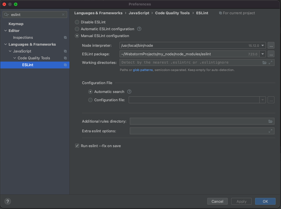 preference > eslint 검색시 JavaScript > Code Quality Tools의 ESLint