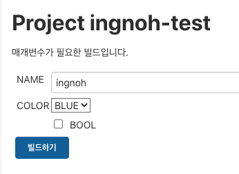 - 적절히 입력한 후 빌드하기를 클릭하면, 마찬가지로 Build History에 빌드 결과가 추가된다.