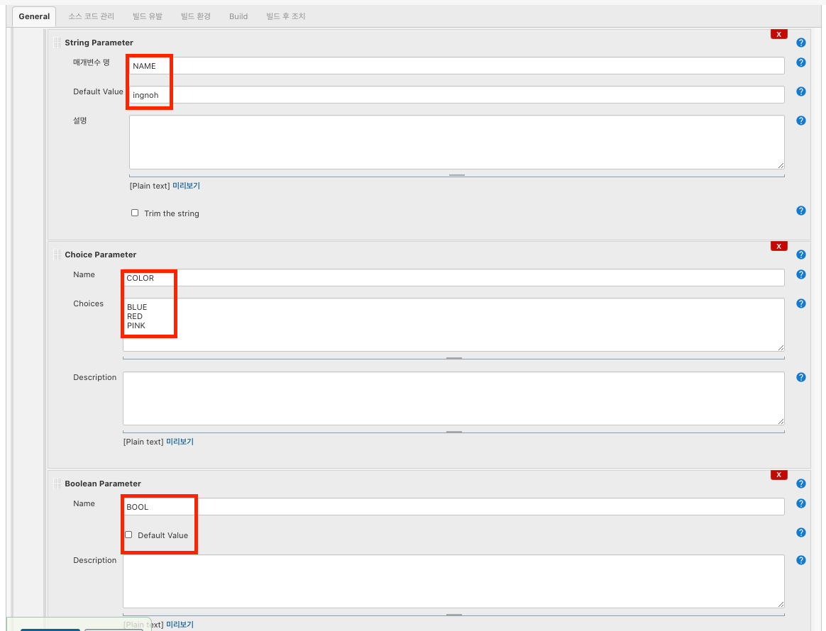 - General 탭 > '이 빌드는 매개변수가 있습니다' 선택 > 매개변수 추가