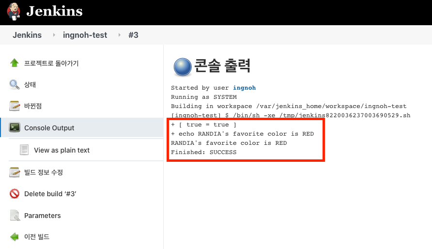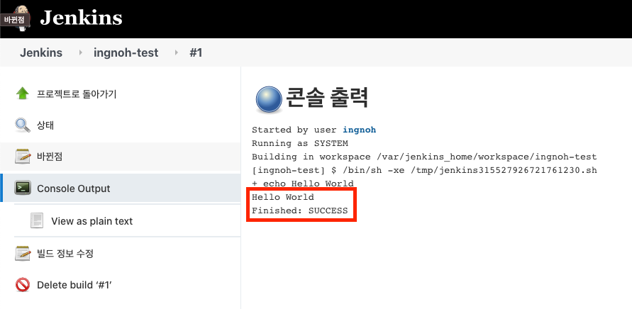 - Build History > Build 결과(아마도 #1) 클릭 > Console Output