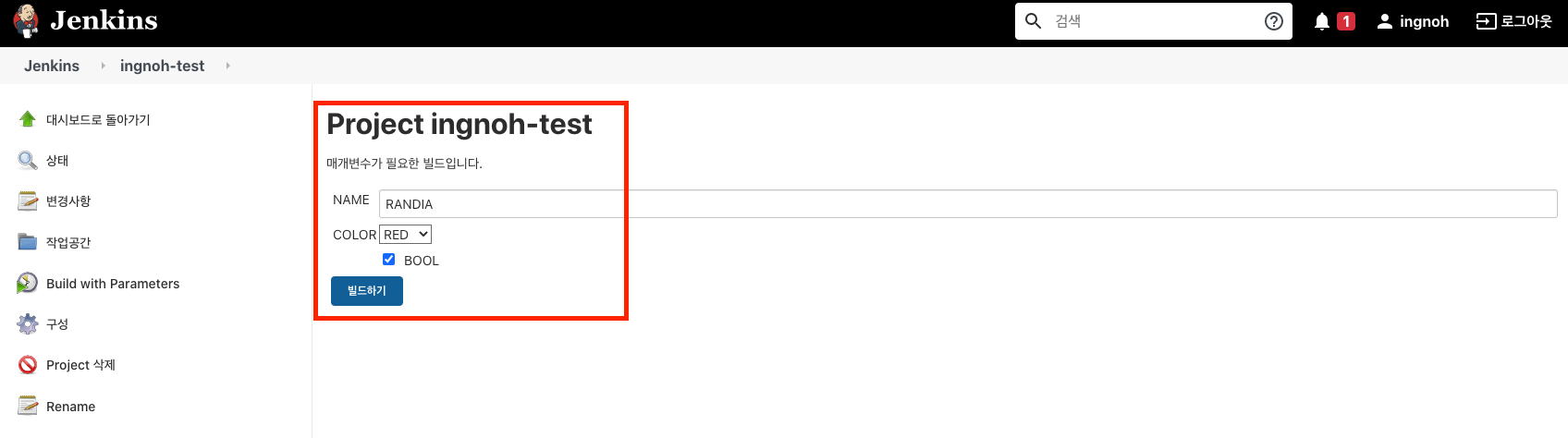 - 생성해둔 freestyle project로 돌아와보면, Build now가 매개변수 설정으로 인해 Build with Parameters로 바뀌어 있음.